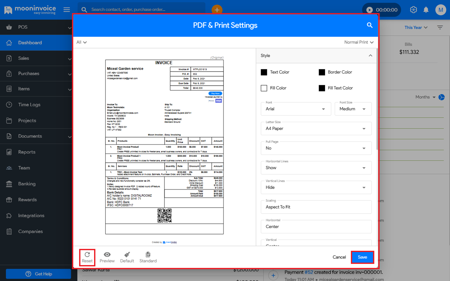 You can easily reset the pdf settings in Moon Invoice by following the steps below.