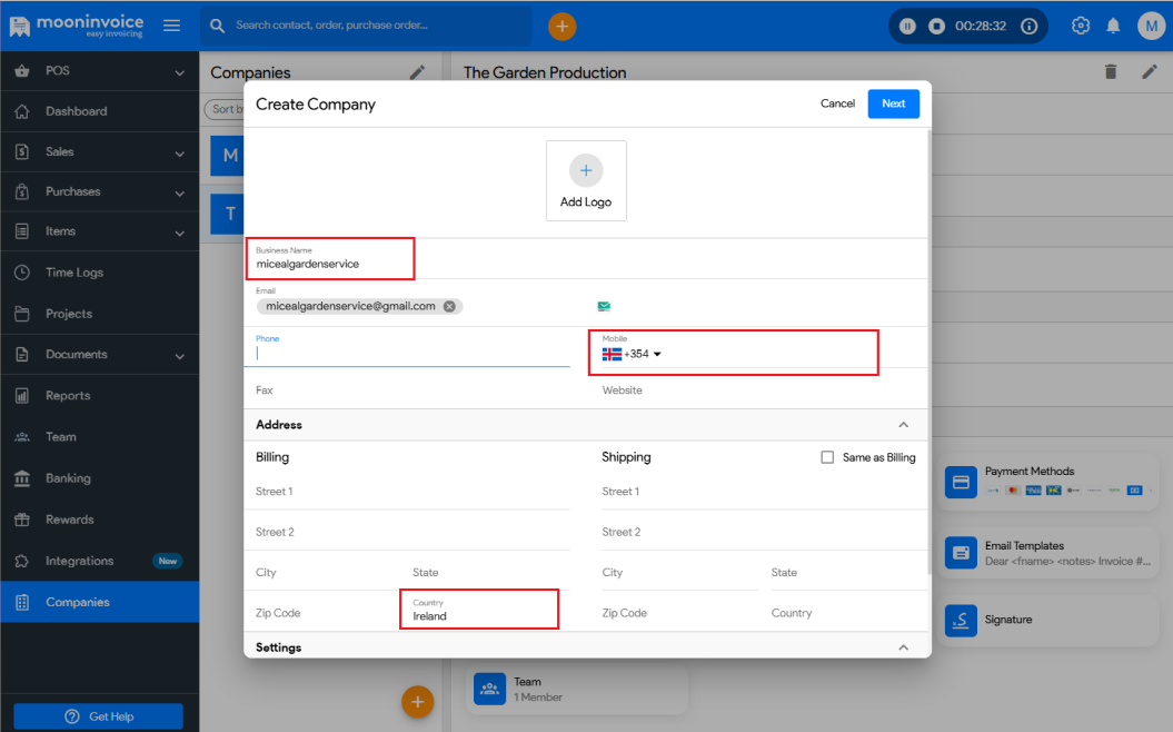- Note: Selecting the country is mandatory when creating a new company.
