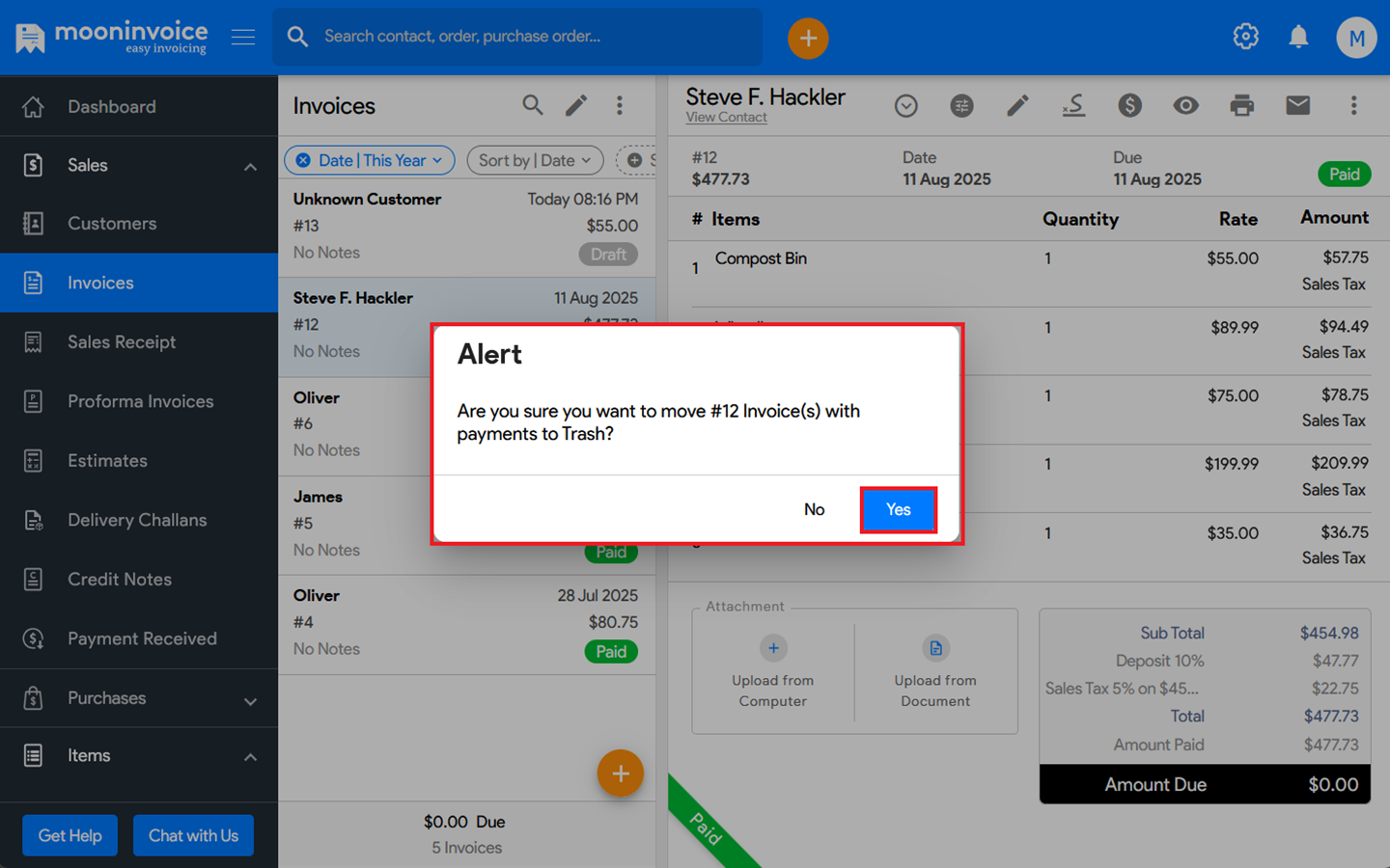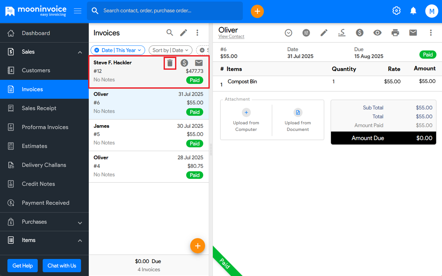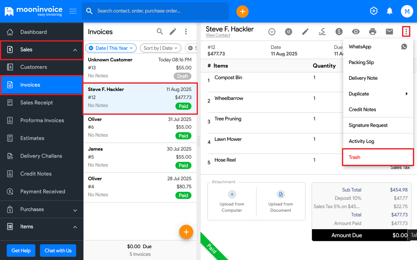 Note: You can also delete an invoice by directly clicking on the Trash option located just above.