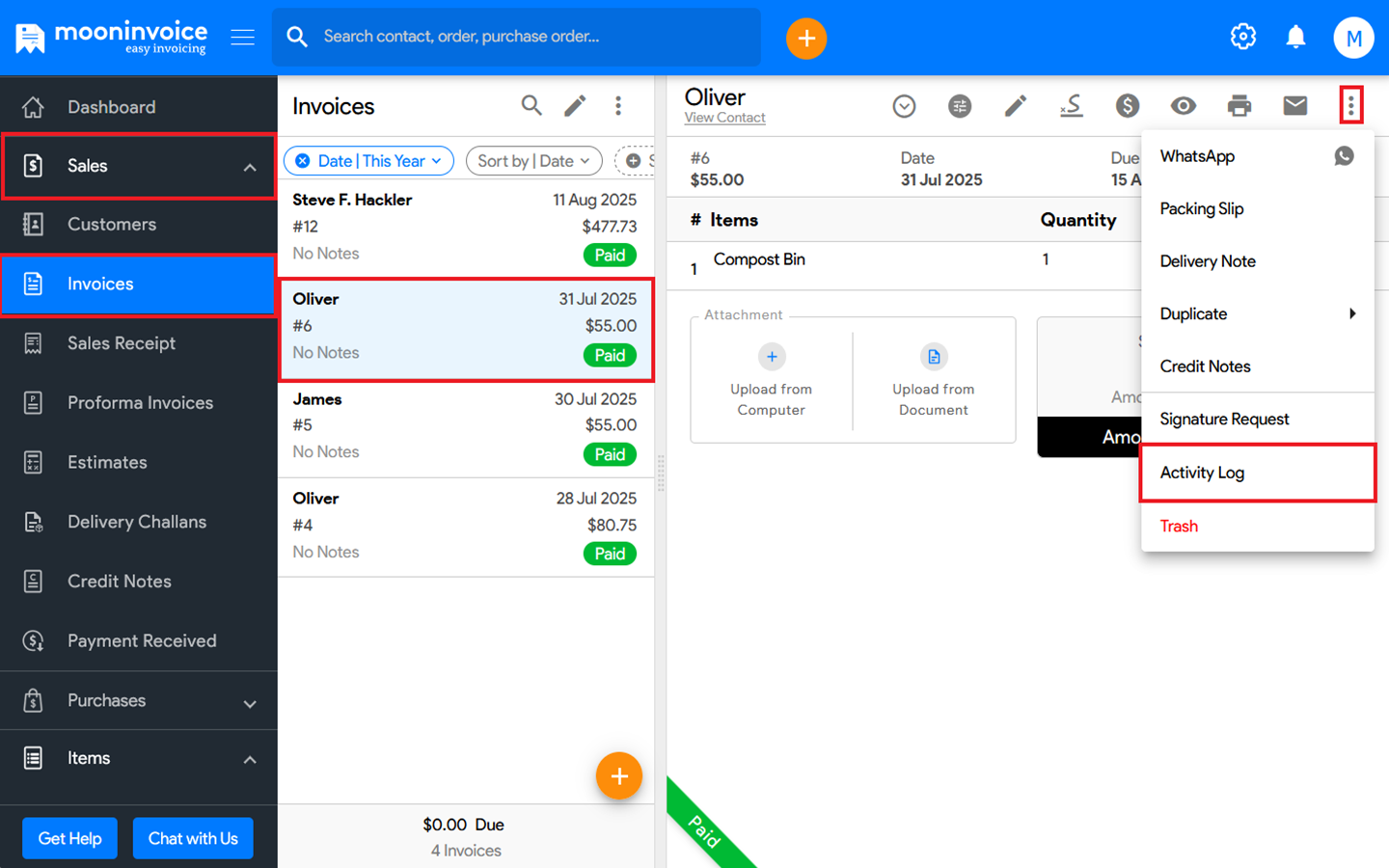 - Click on the existing invoice, then on the right-hand side, click the three-dot icon (⋮) and select Activity Log.