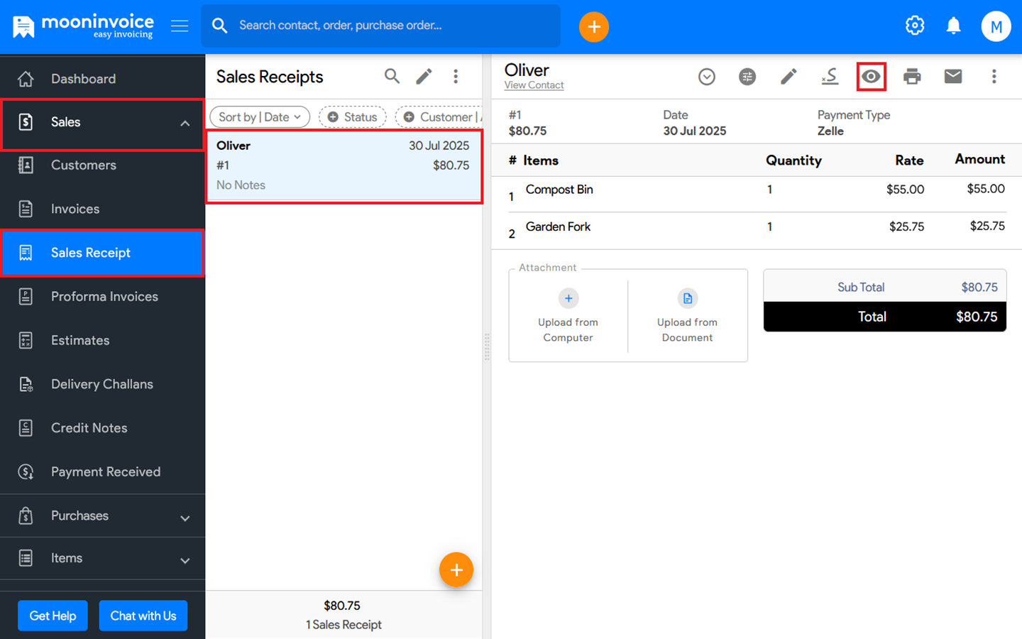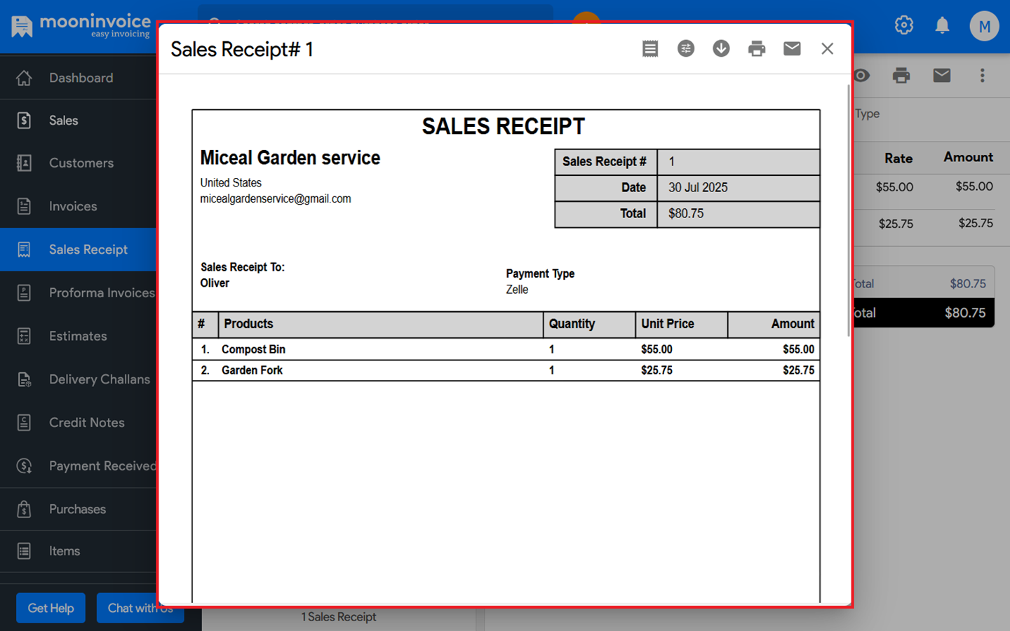 You can preview the sales receipt in Moon Invoice easily by following the steps below.