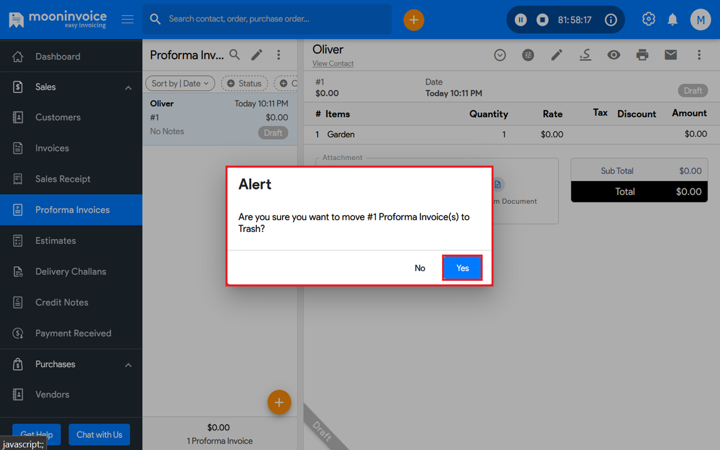 You can trash a proforma invoice in Moon Invoice easily by following the steps below.