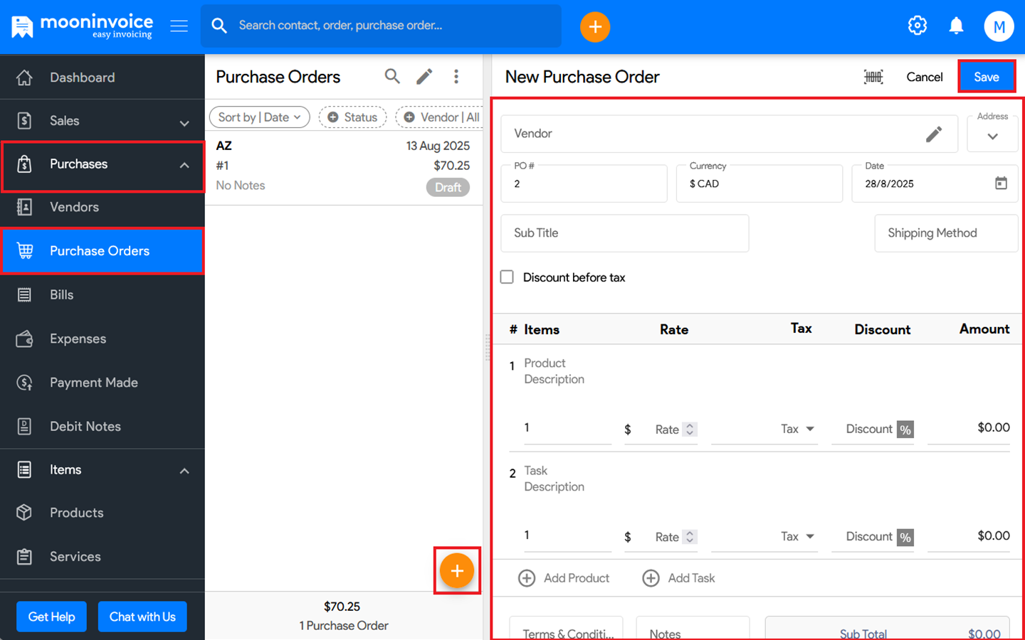 You can create a new purchase order in Moon Invoice easily by following the steps below.