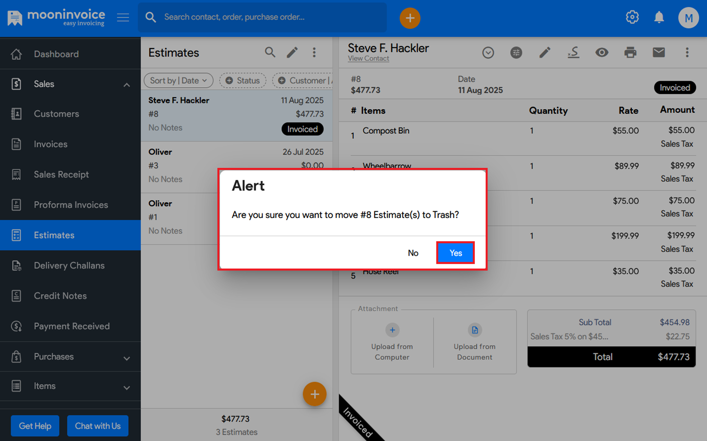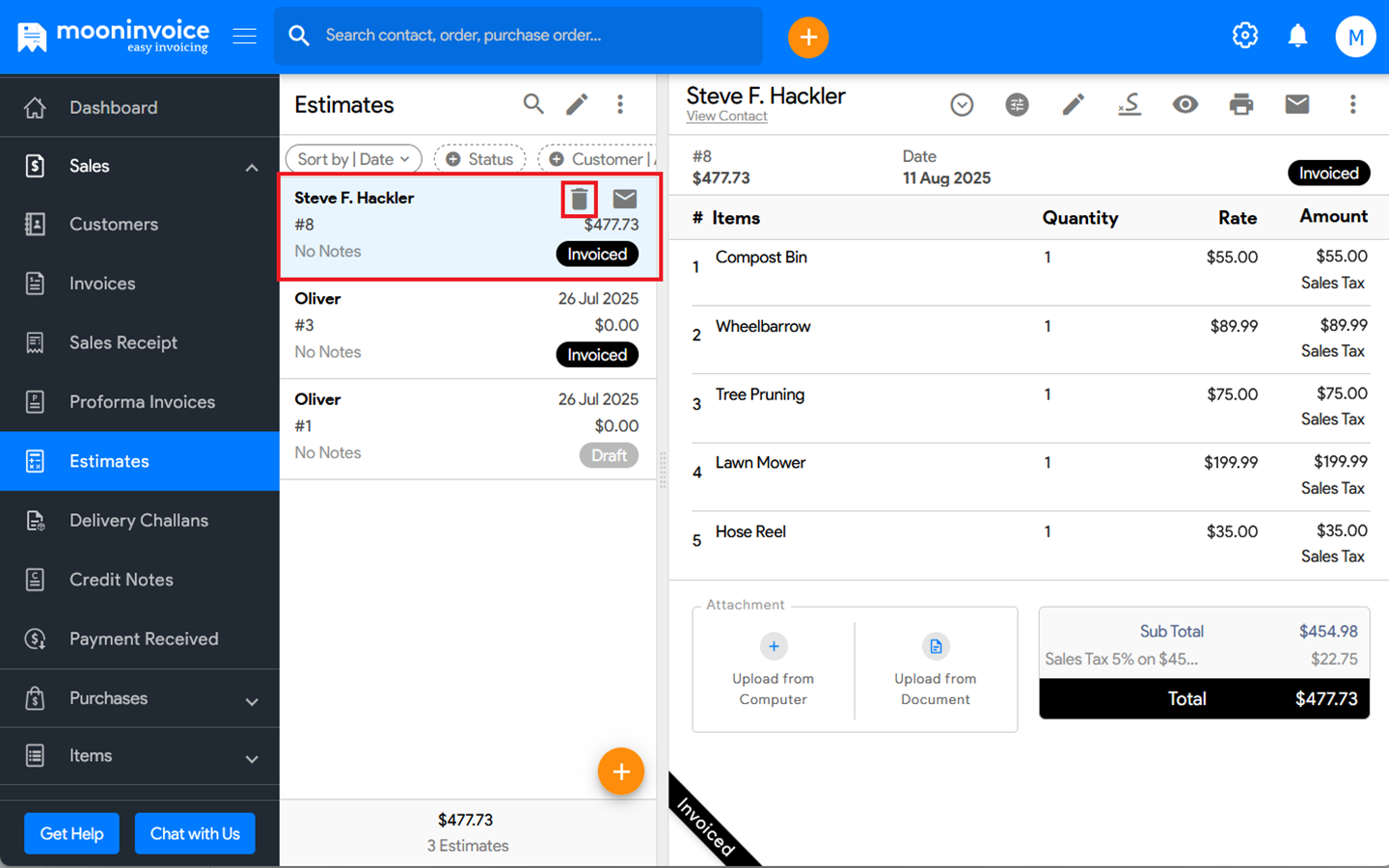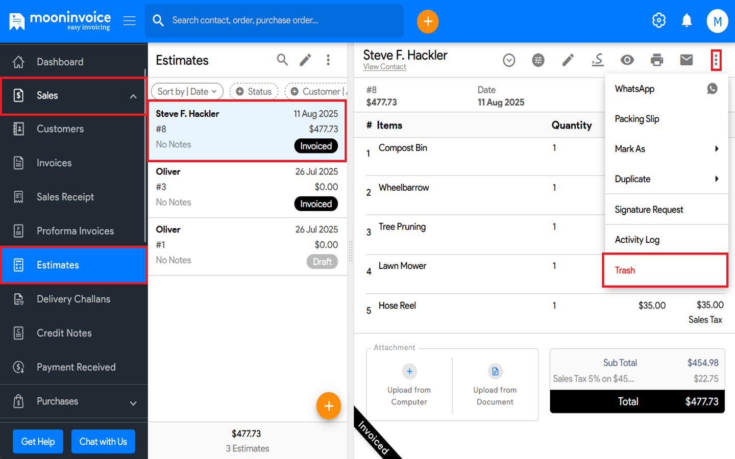 You can move an estimate to trash in Moon Invoice easily by following the steps below.