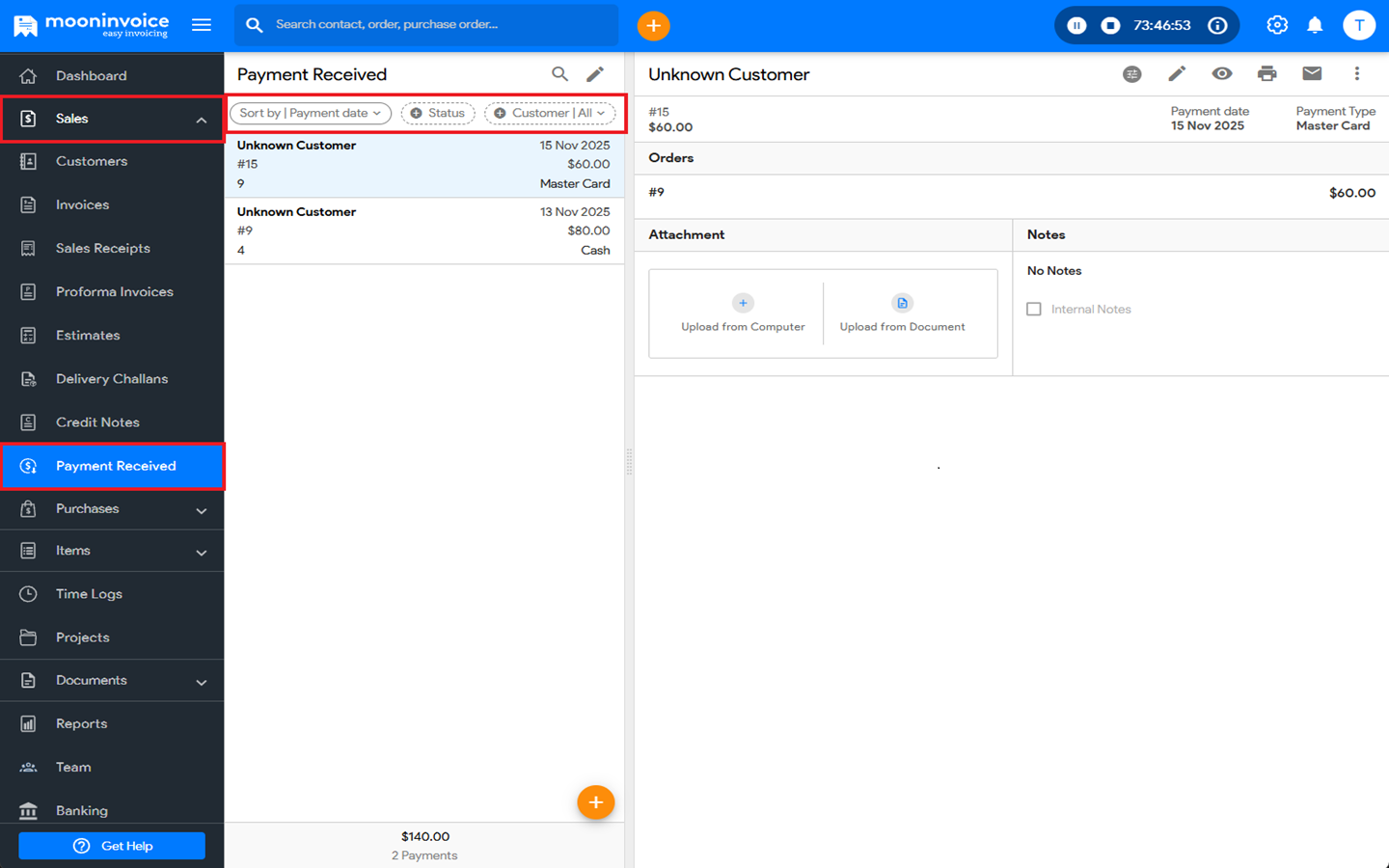 You can filter payment received by type and customer in Moon Invoice easily by following the steps below.