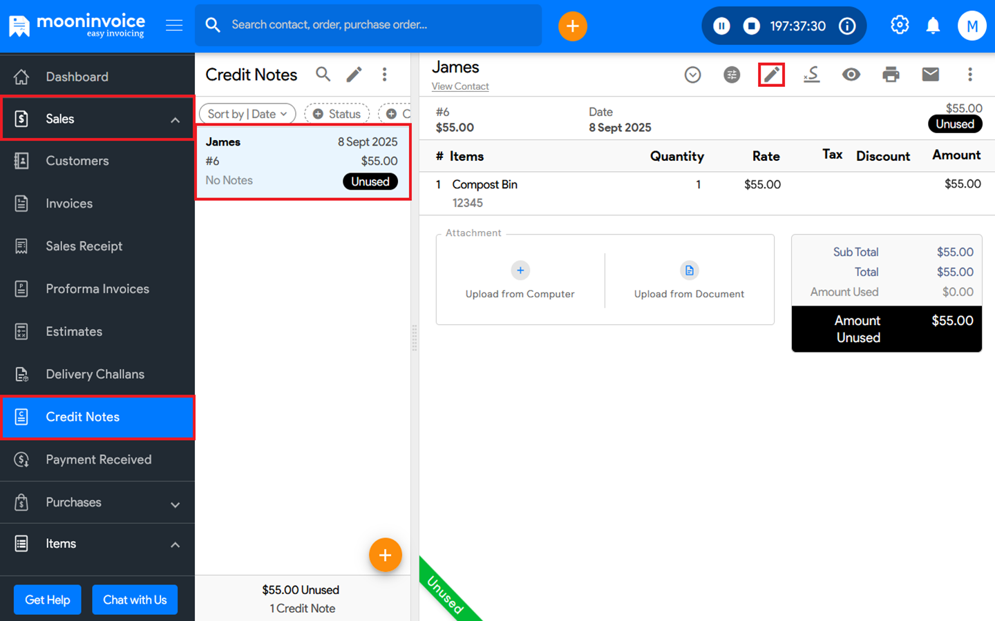 You can edit the credit note in Moon Invoice easily by following the steps below.