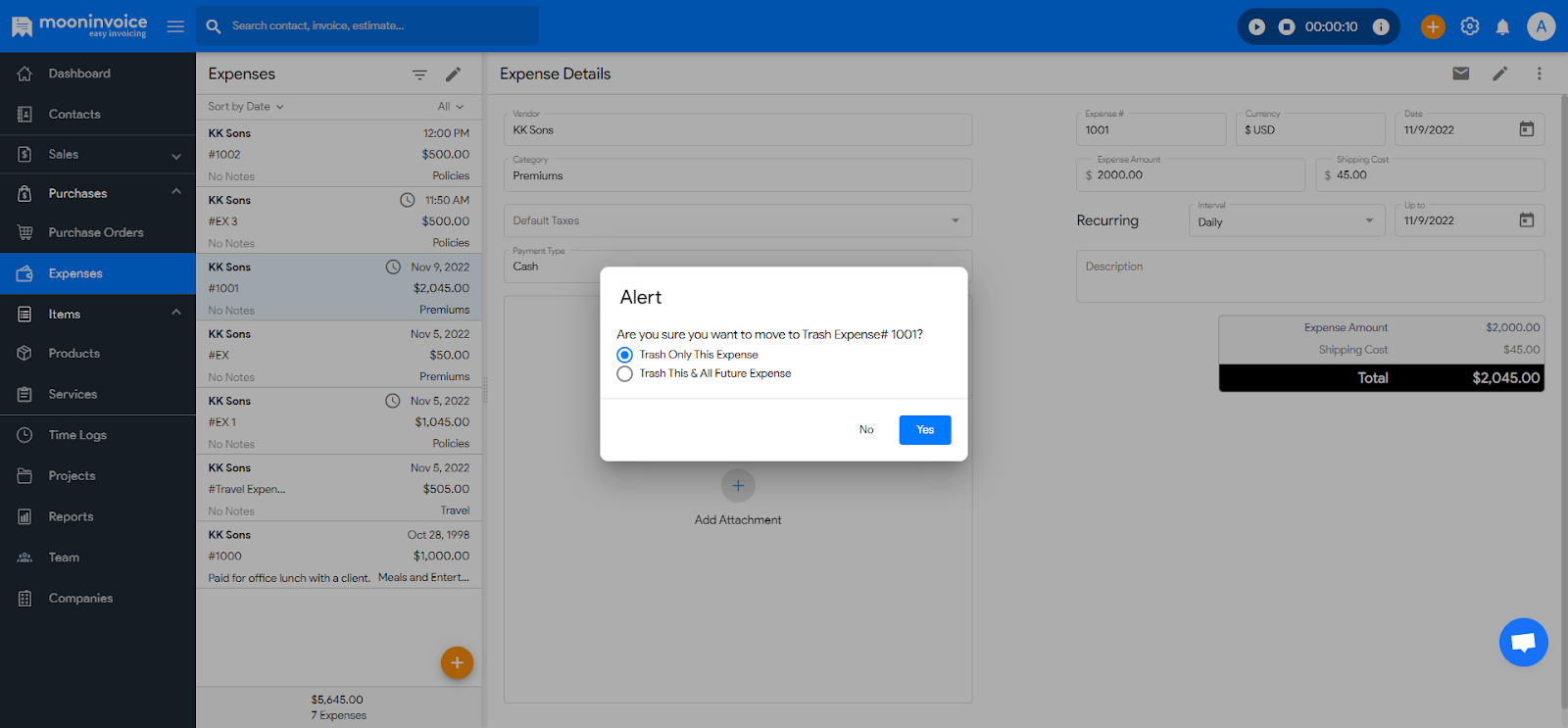 To trash an expense from your Moon Invoice account, please follow these steps