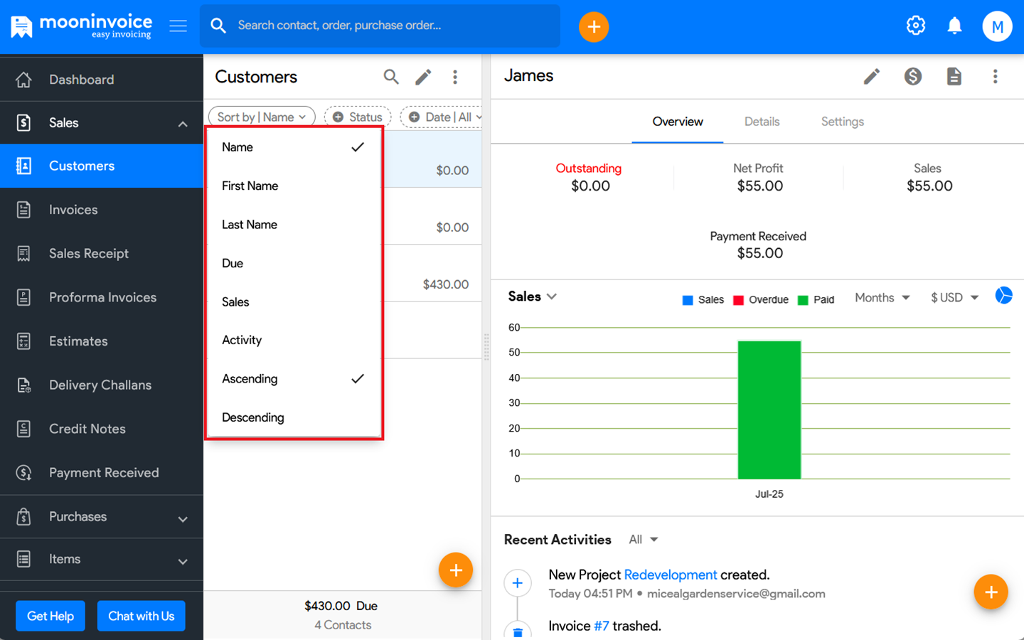 You can sort the customer by name in Moon Invoice easily by following the steps below.