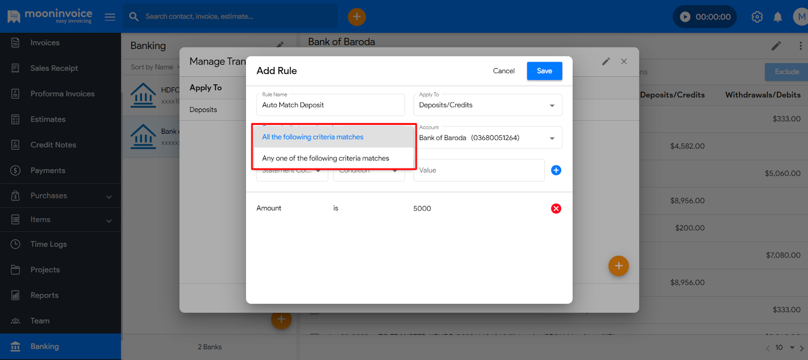 - Let's assume we want to create a rule to match an amount of $5000, Begin by selecting "amount" to create the rule.