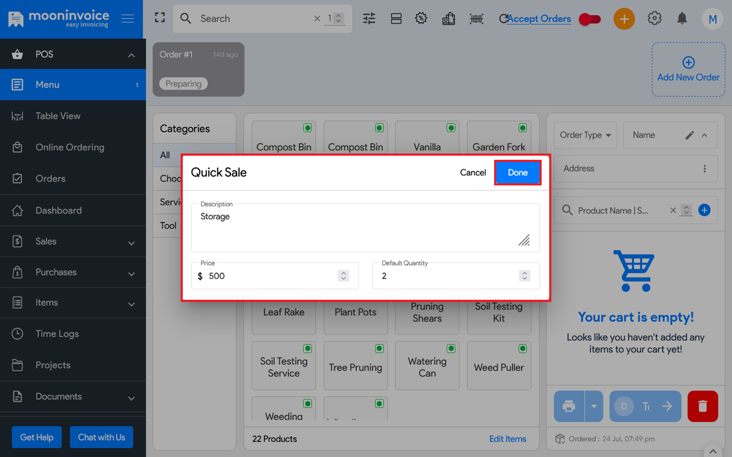 - Enter the Product Name in the description, Price, and Quantity, then click Done.