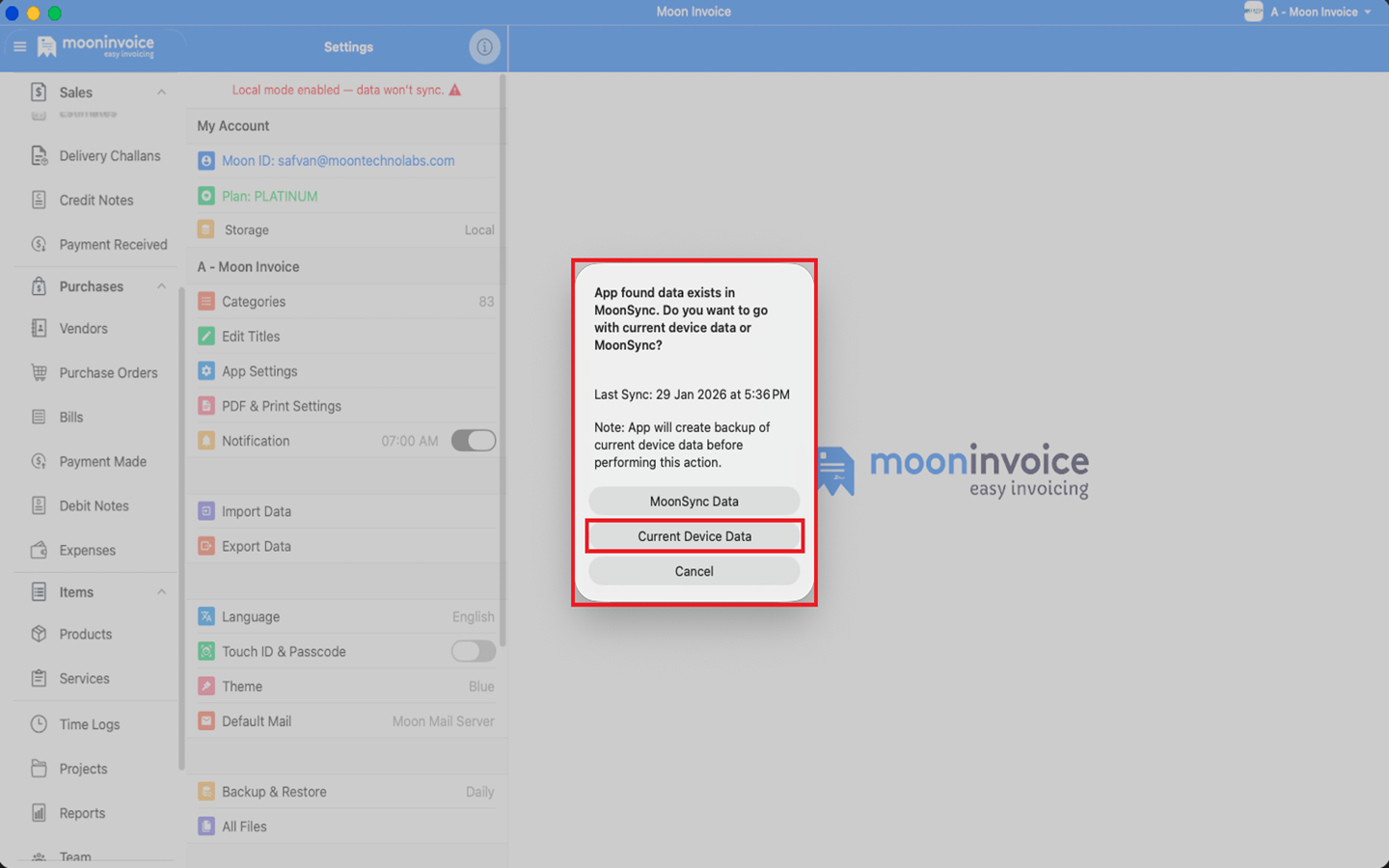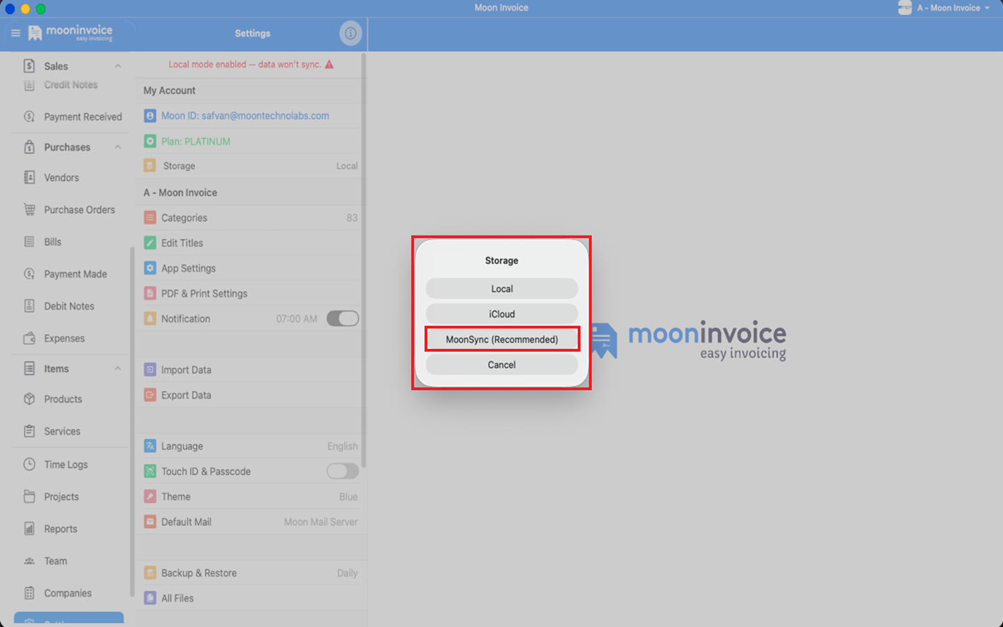 You can easily sync your data in real-time between different devices in Moon Invoice by following the steps below.