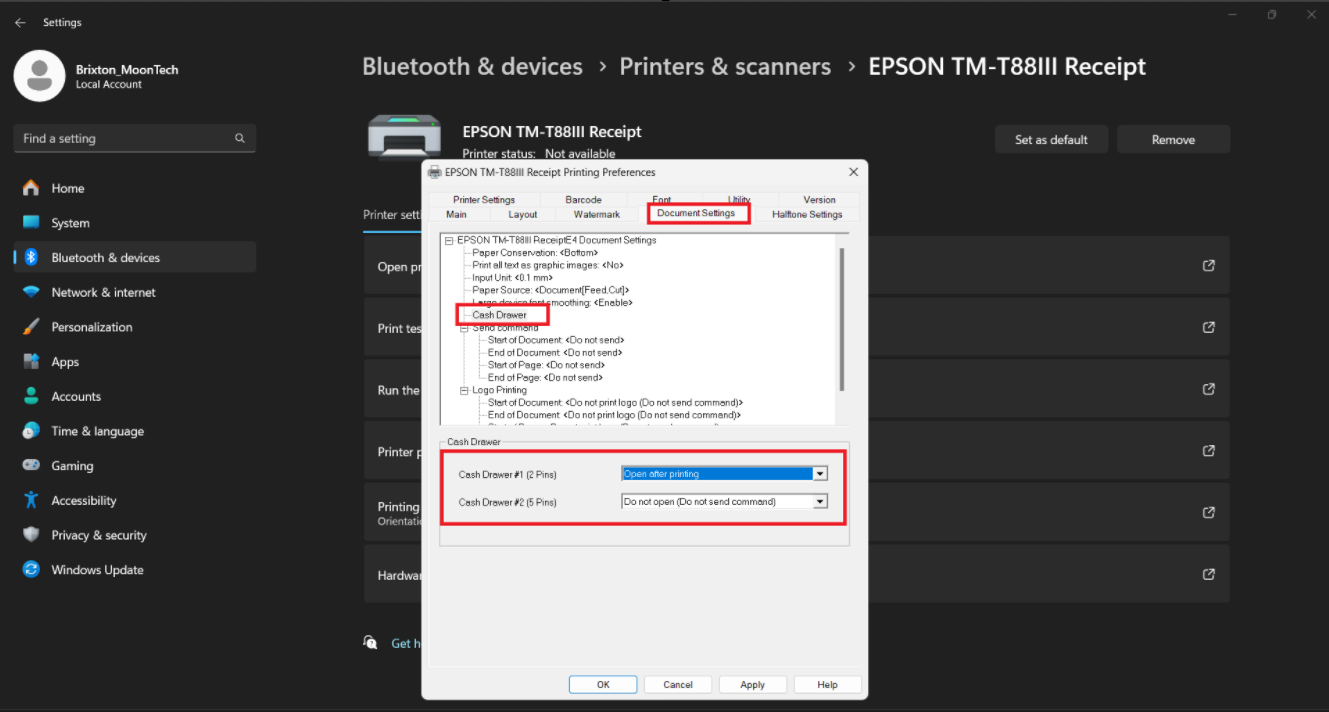 3. In Printing Preferences, enable the Cash Drawer option under Printer Commands/Document Settings, and save.
