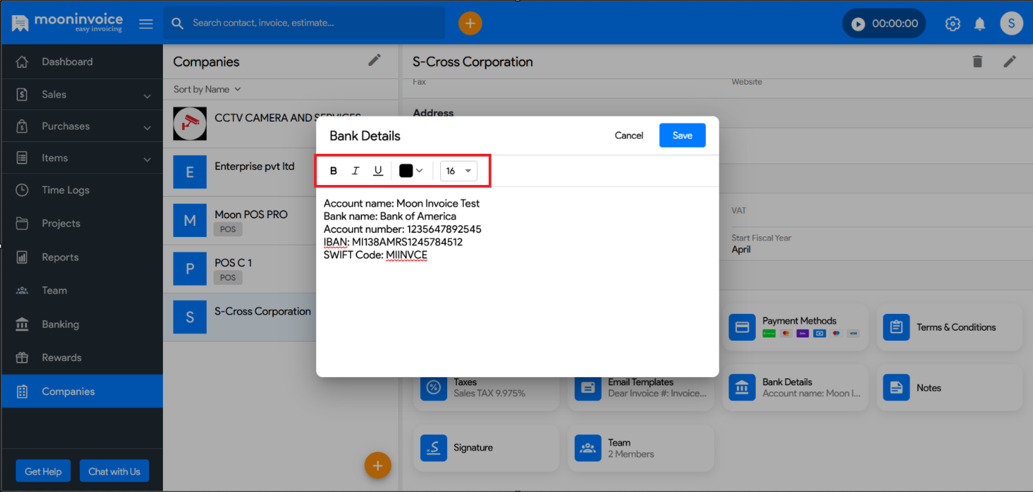 Moon Invoice helps you adjust the font size and apply bold or italic styles to your bank details text according to your preferences.