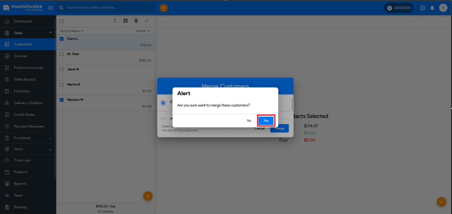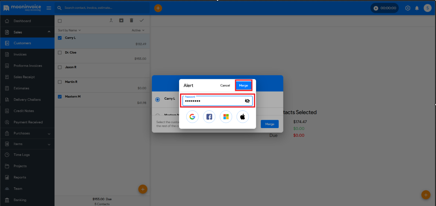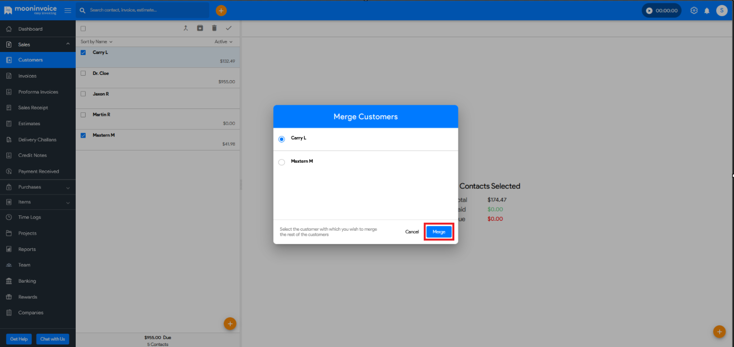Moon Invoice allows you to merge two or more customers into one customer data.