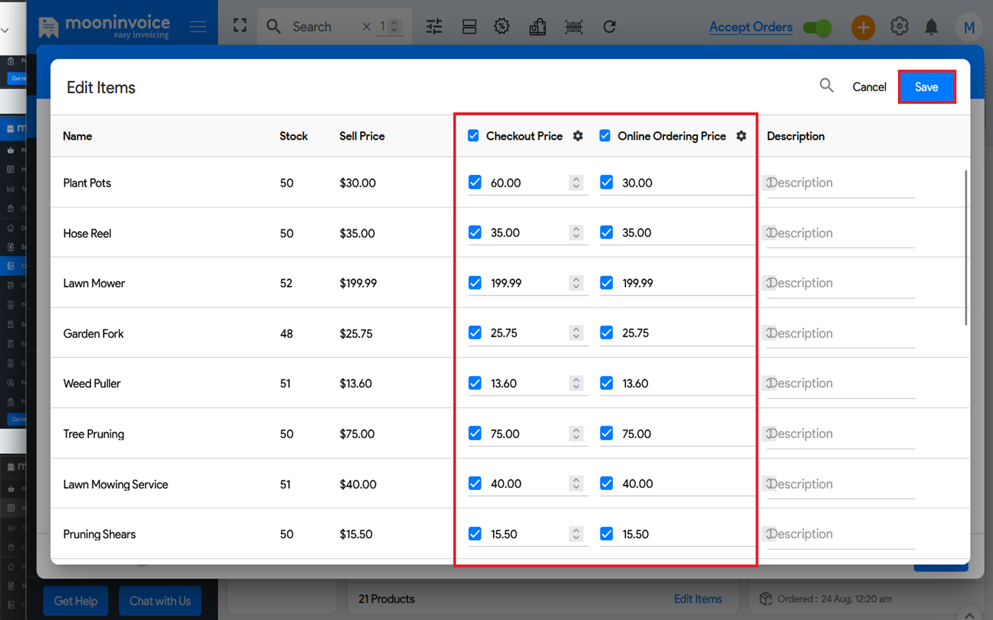 You can change item sell price, checkout price, and online ordering price in Moon POS easily by following the steps below.