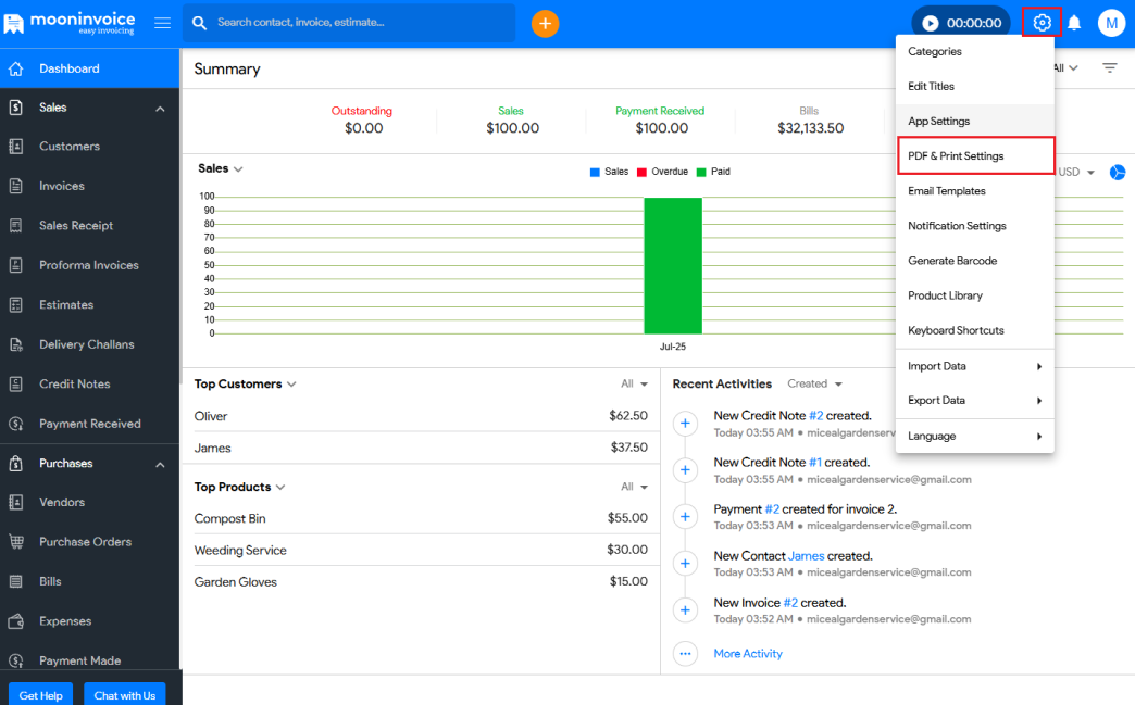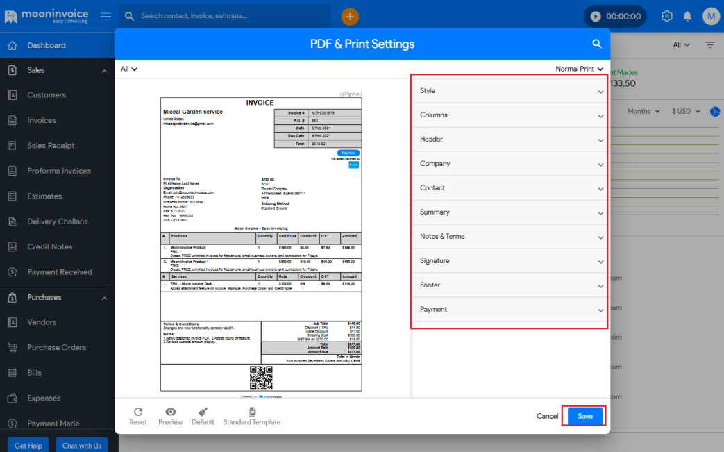 You can view the PDF & Print Settings in Moon Invoice easily by following the steps below.