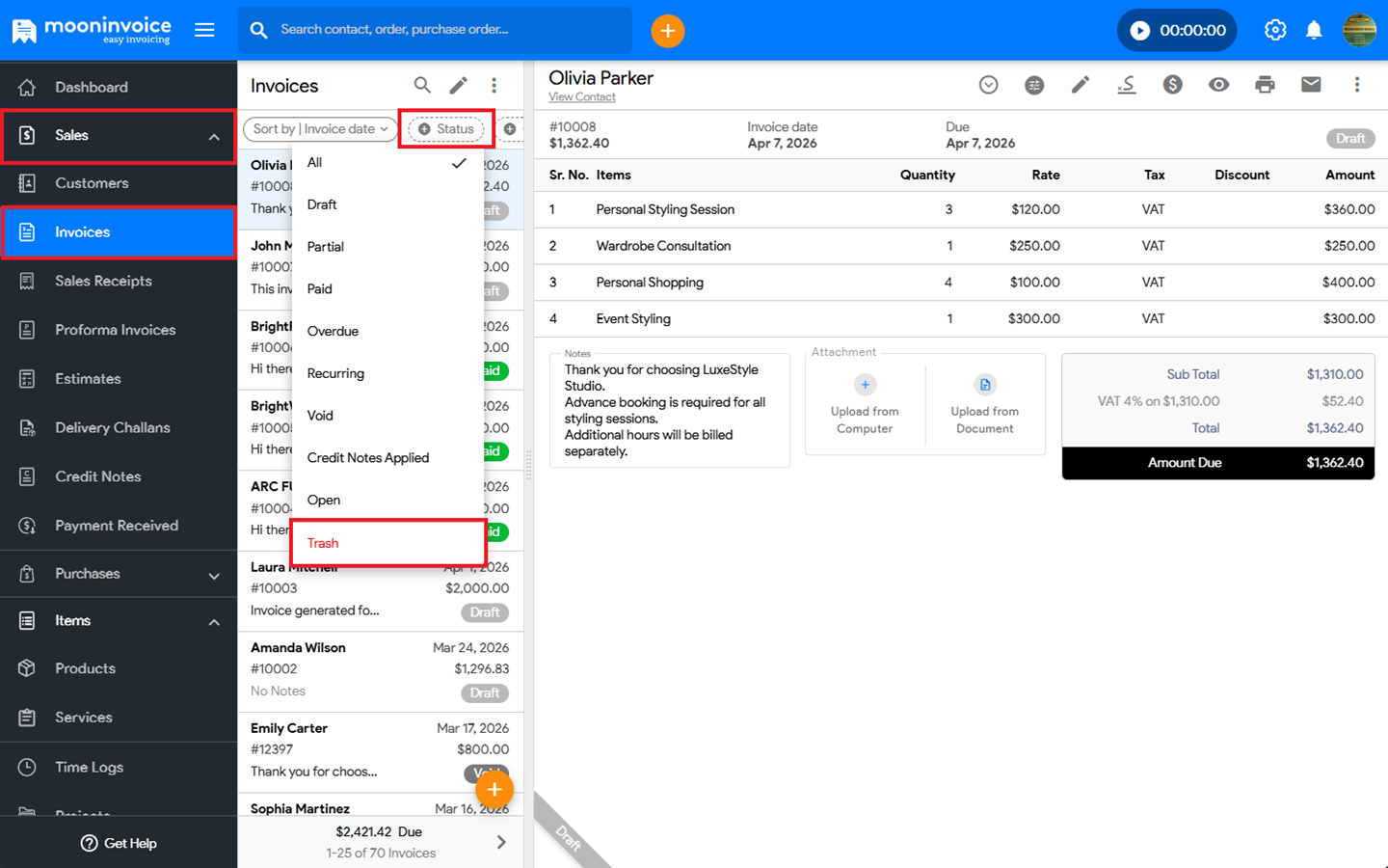 You can easily restore Invoice, Estimate, & PO from Trash in Moon Invoice by following the steps below: