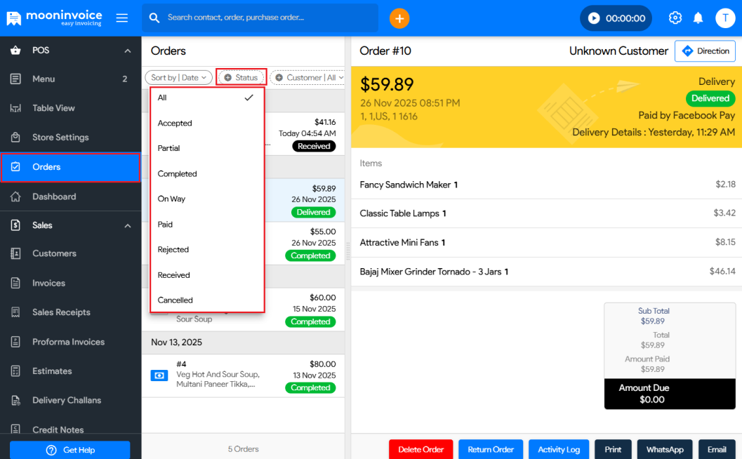 - In the Moon POS, go to ‘Orders’ from the main menu.