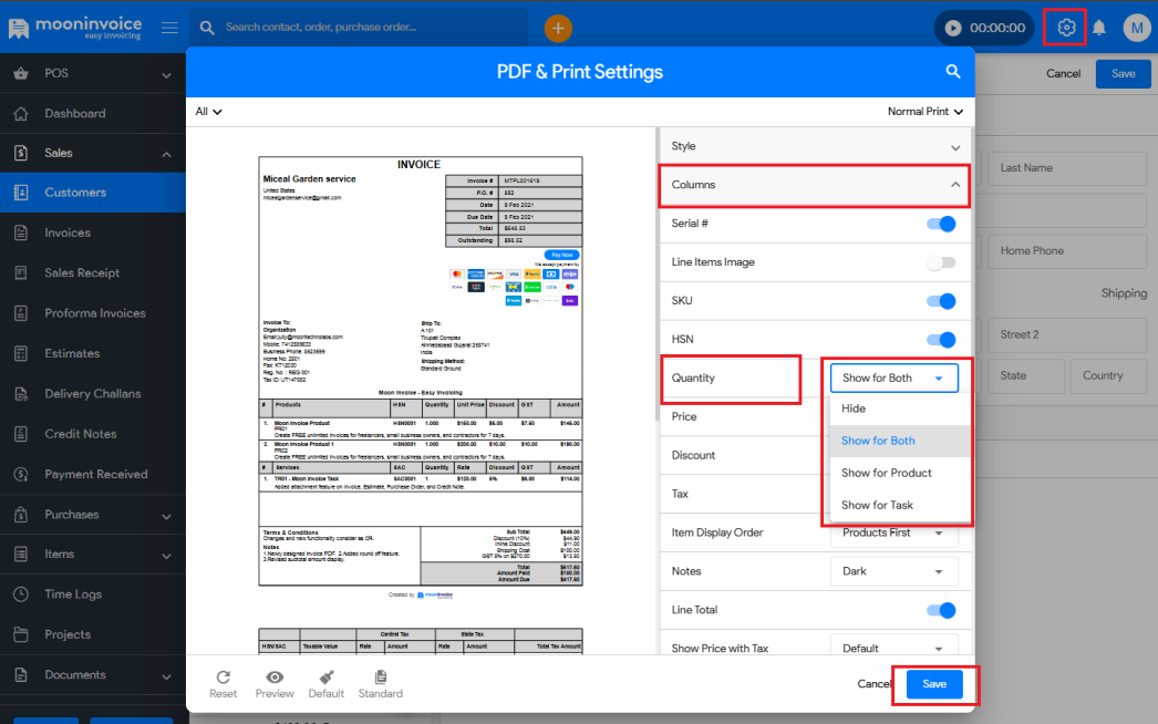 Here are the steps to hide or show the quantity from the invoice PDF
