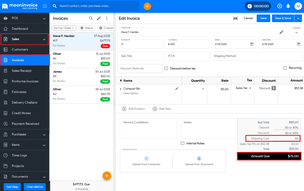 To add shipping charges under the Invoice, follow these steps: