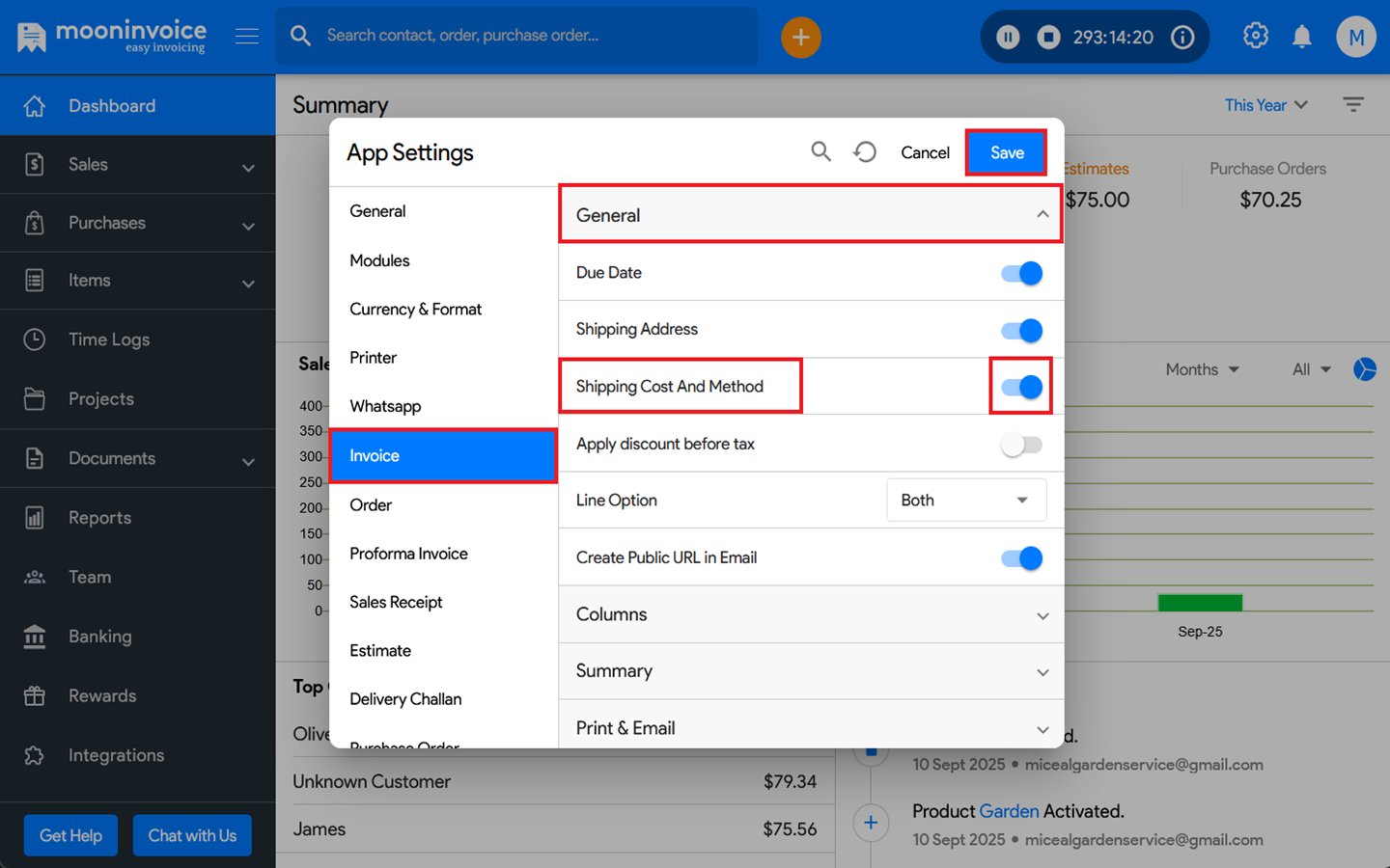 You can easily enable or disable shipping cost and method in an Invoice by following the steps below.