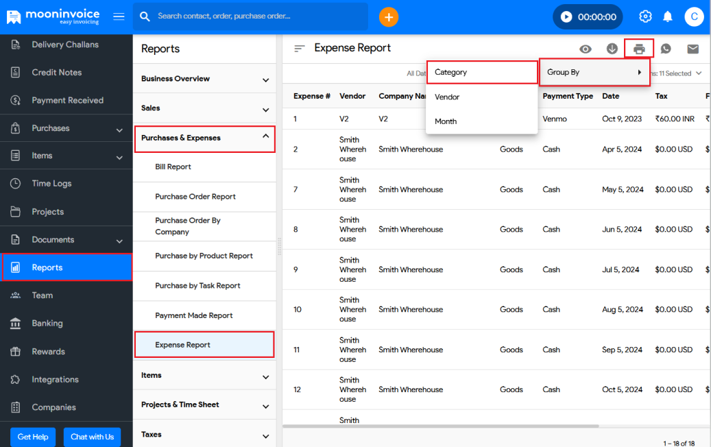 To print the expense report by category, follow the steps below: