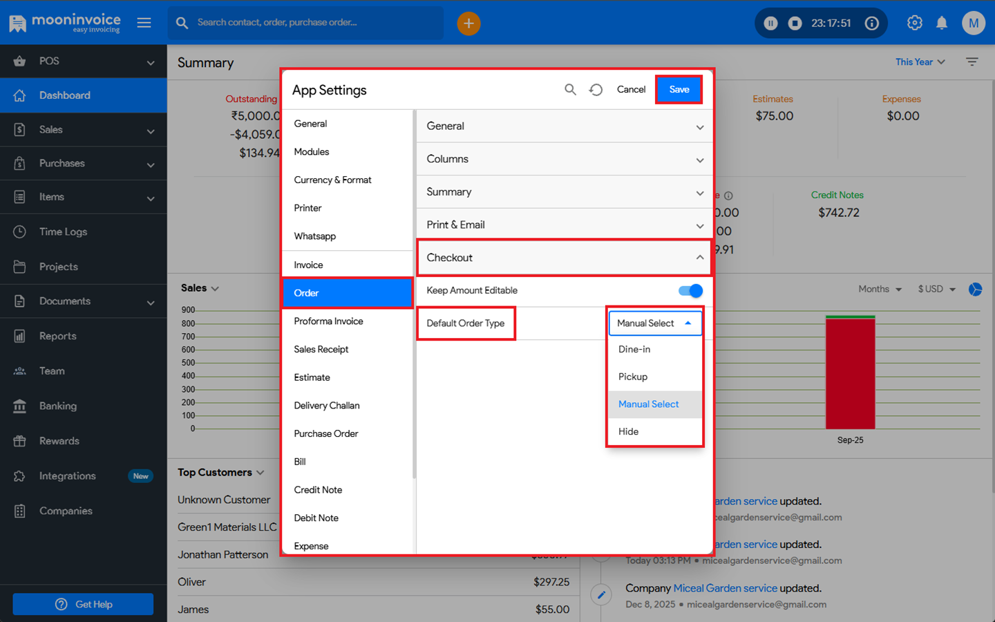 You can easily select different options for the default order type in Moon Invoice by following the steps below.