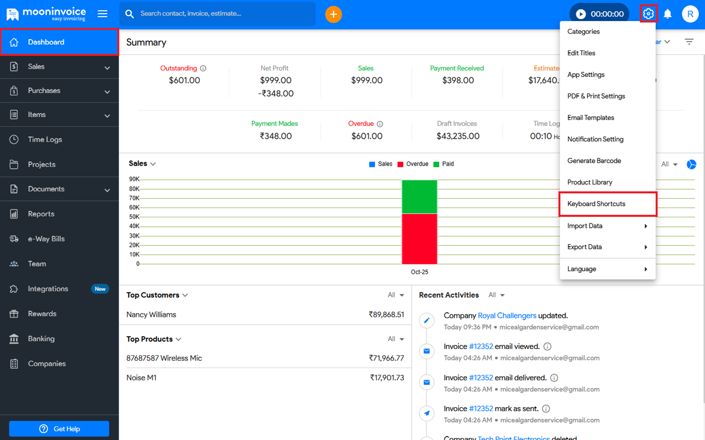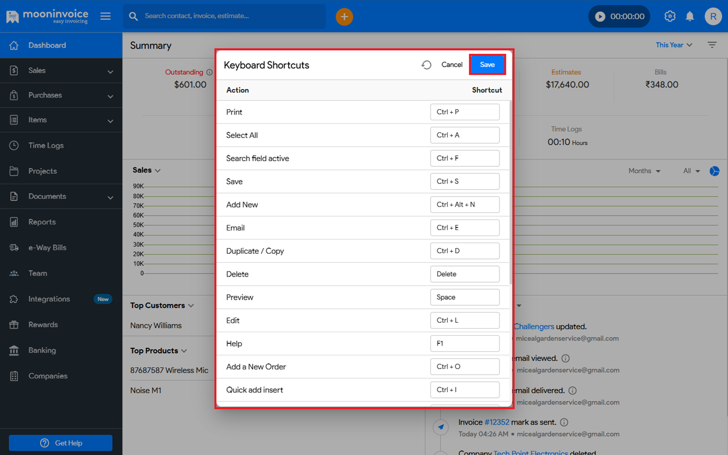 You can change the keyboard shortcuts in Moon Invoice by following the steps below.