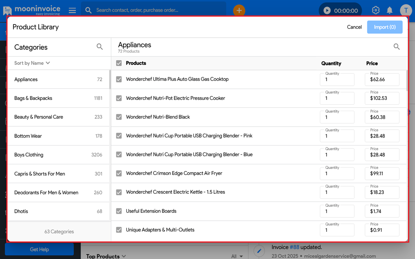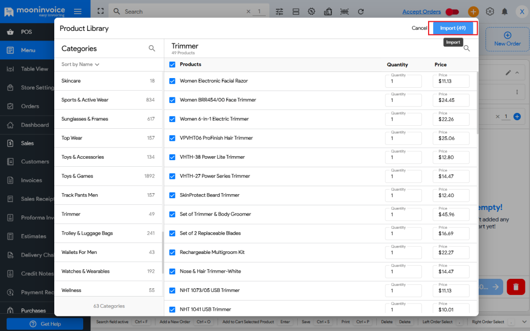 You can easily view and import the products from the product library in Moon Invoice by following the steps below.