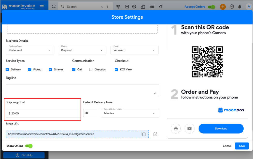 Here are the steps to add shipping cost for online orders in Moon POS: