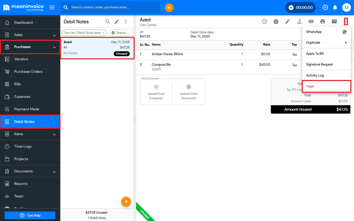 - Open the existing debit note, click the three-dot icon (⋮), and select Trash.