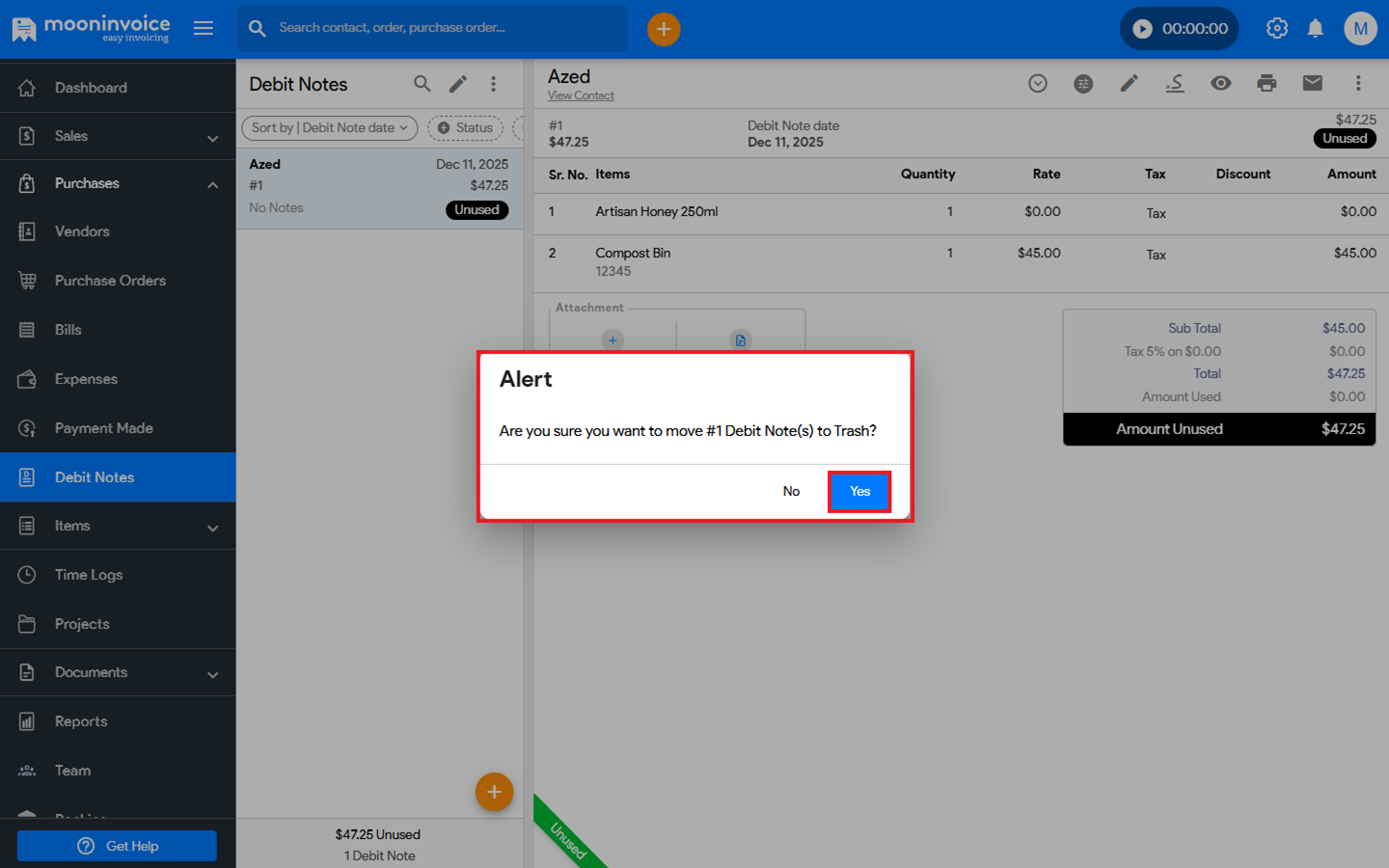 - Confirm the action by clicking Yes to move the debit note to the trash.
