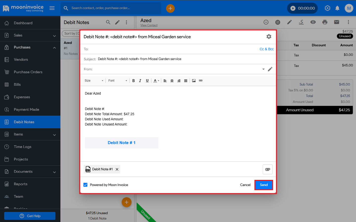 - Fill in the required details and click Send to email the debit note.