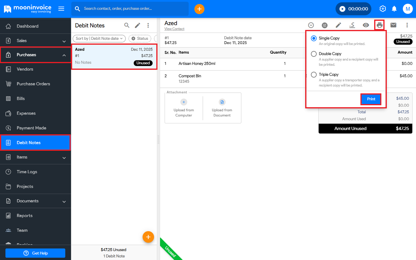You can easily and directly print a debit note in Moon Invoice by following the steps below.