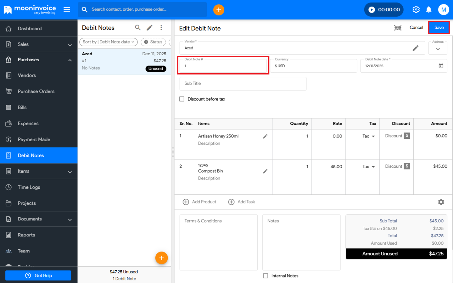 - Click on Debit Note # and enter your custom debit note number.