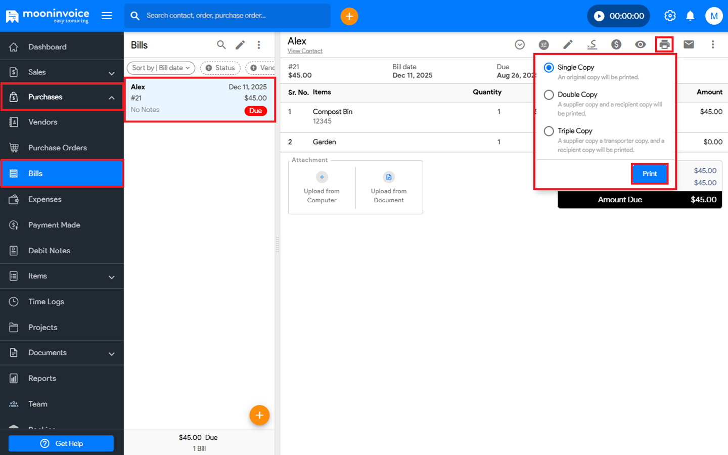 You can easily and directly print a bill in Moon Invoice by following the steps below.