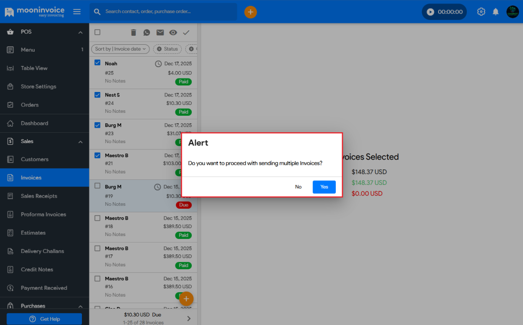 - If you select invoices for different customers, you will see an alert saying “Do you want to proceed with sending multiple invoices?”