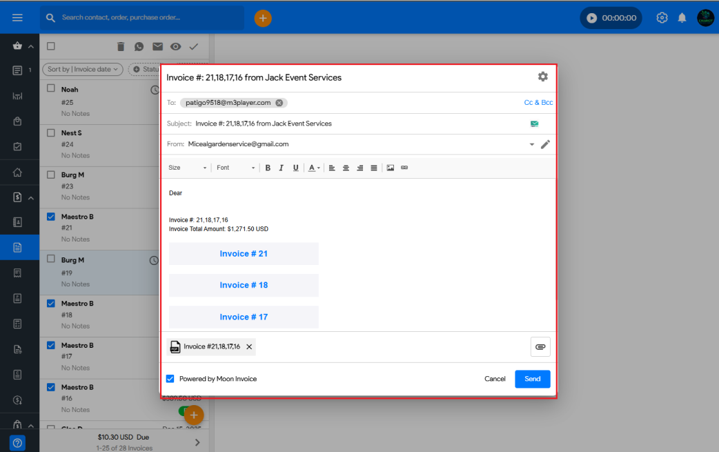- If you select invoices for the same customer, an email editor will open to send the email.