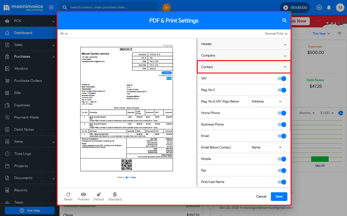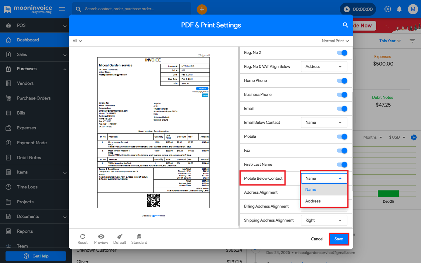 You can change the mobile below contact in Moon Invoice easily by following the steps below.