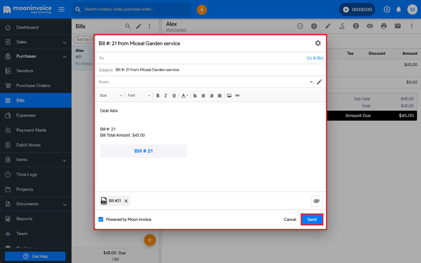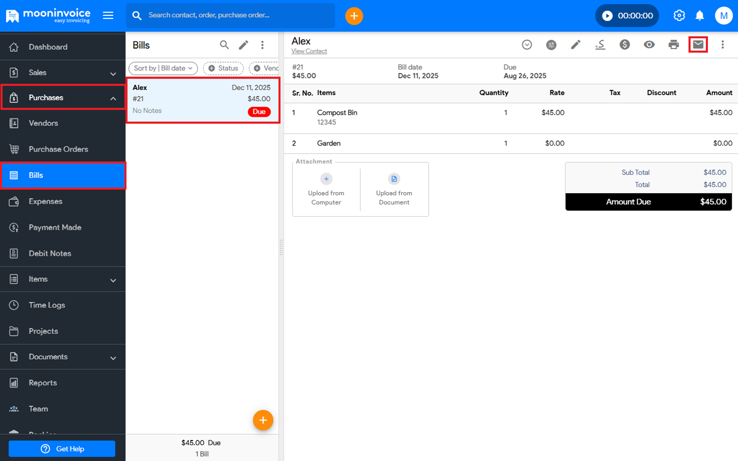 You can easily email a bill to vendors in Moon Invoice by following the steps below.