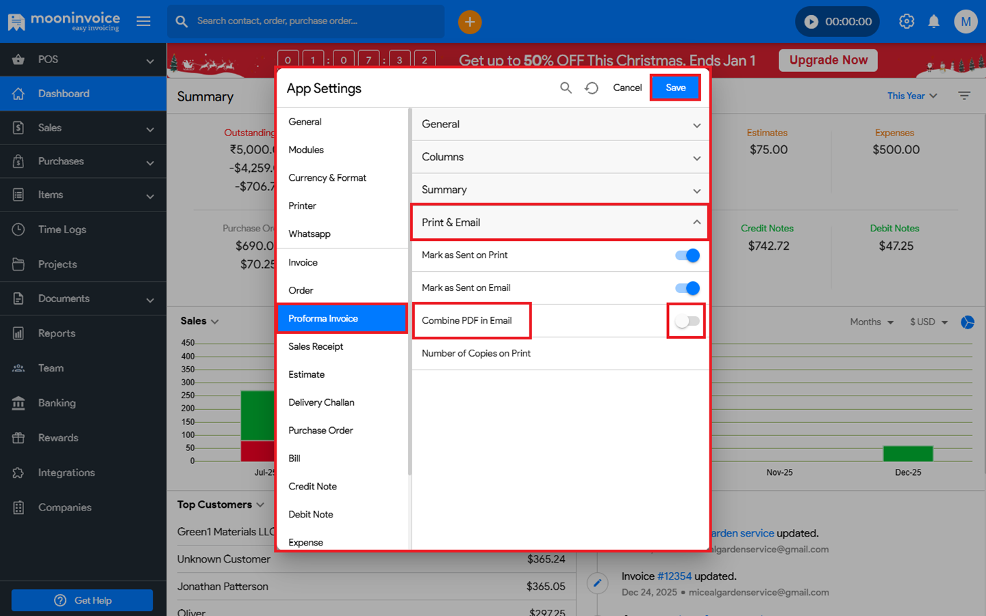 - In the Proforma Invoice section under Print & Email ➜ Combine PDF in Email, use the toggle button to turn it on as needed.