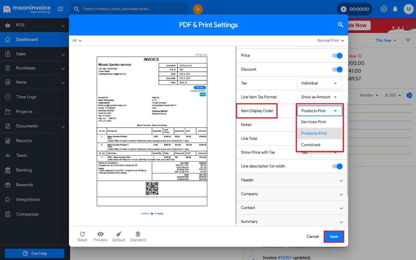You can choose the different options for Item Display Order in Moon Invoice easily by following the steps below.