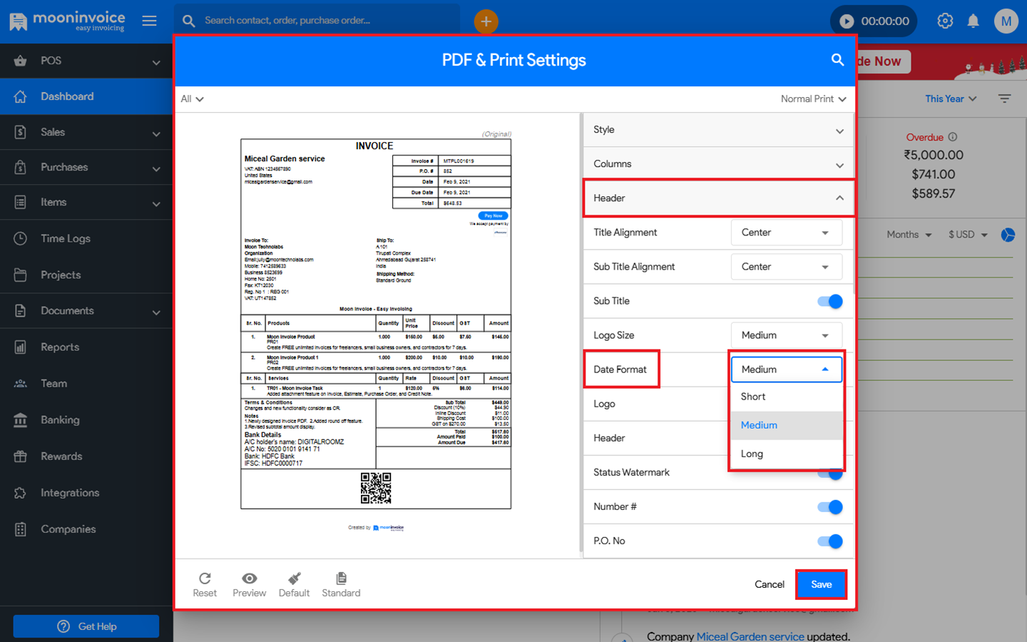 You can change the date format when printing the PDF in Moon Invoice easily by following the steps below.