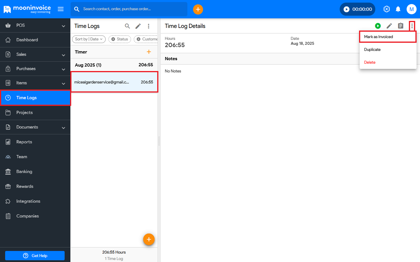 You can easily mark as invoiced a time log in Moon Invoice by following the steps below.