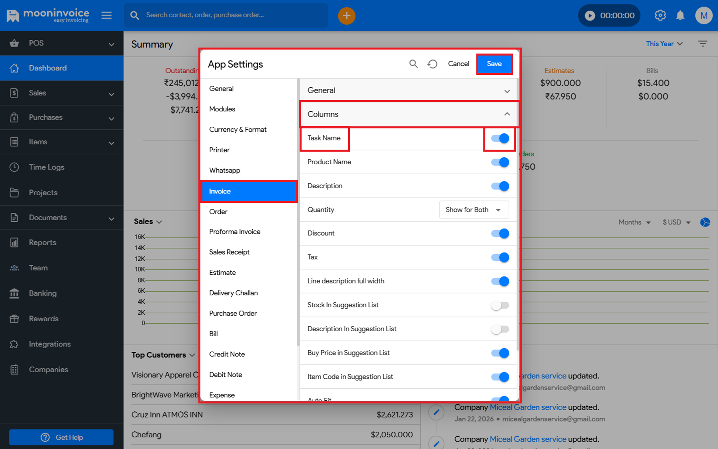 You can easily enable/disable the task name in the invoice in Moon Invoice by following the steps below.