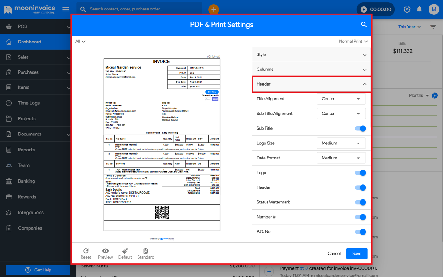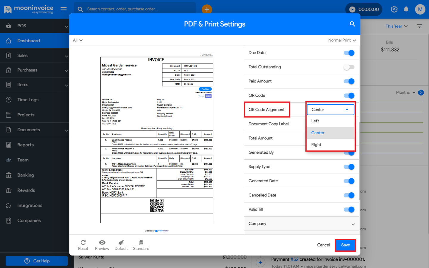 You can easily select different QR Code Alignment options in Moon Invoice by following the steps below.