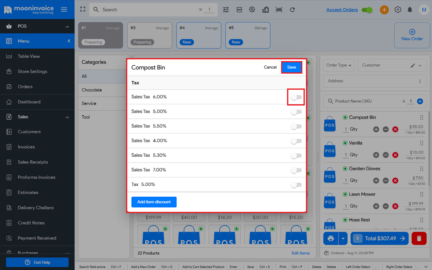 - On the order screen, click the six-dot icon (⋮⋮) on the right-hand side and enable the toggle for the tax rate you want to apply.