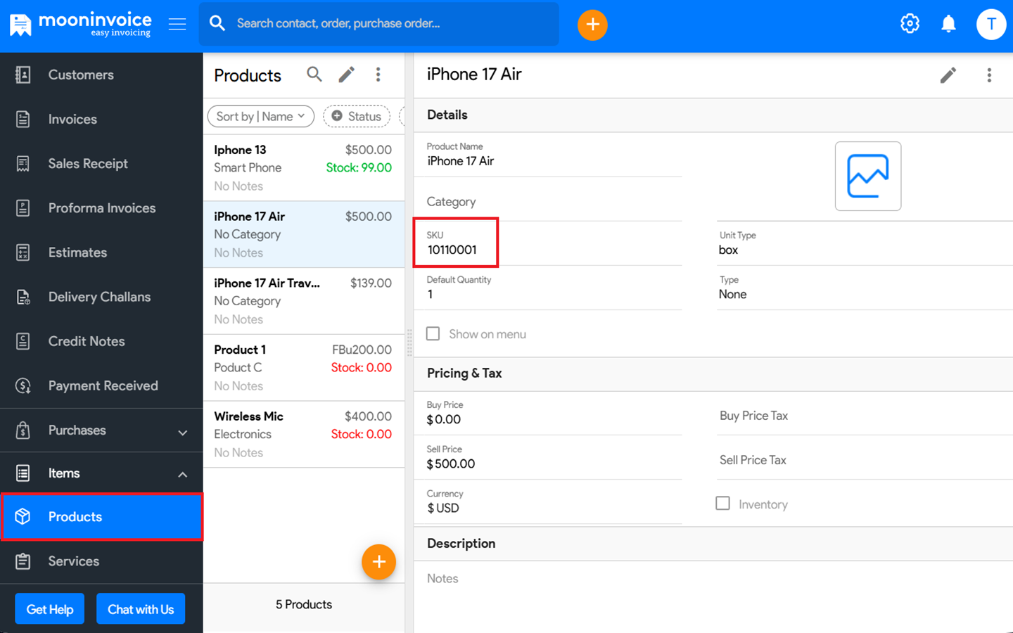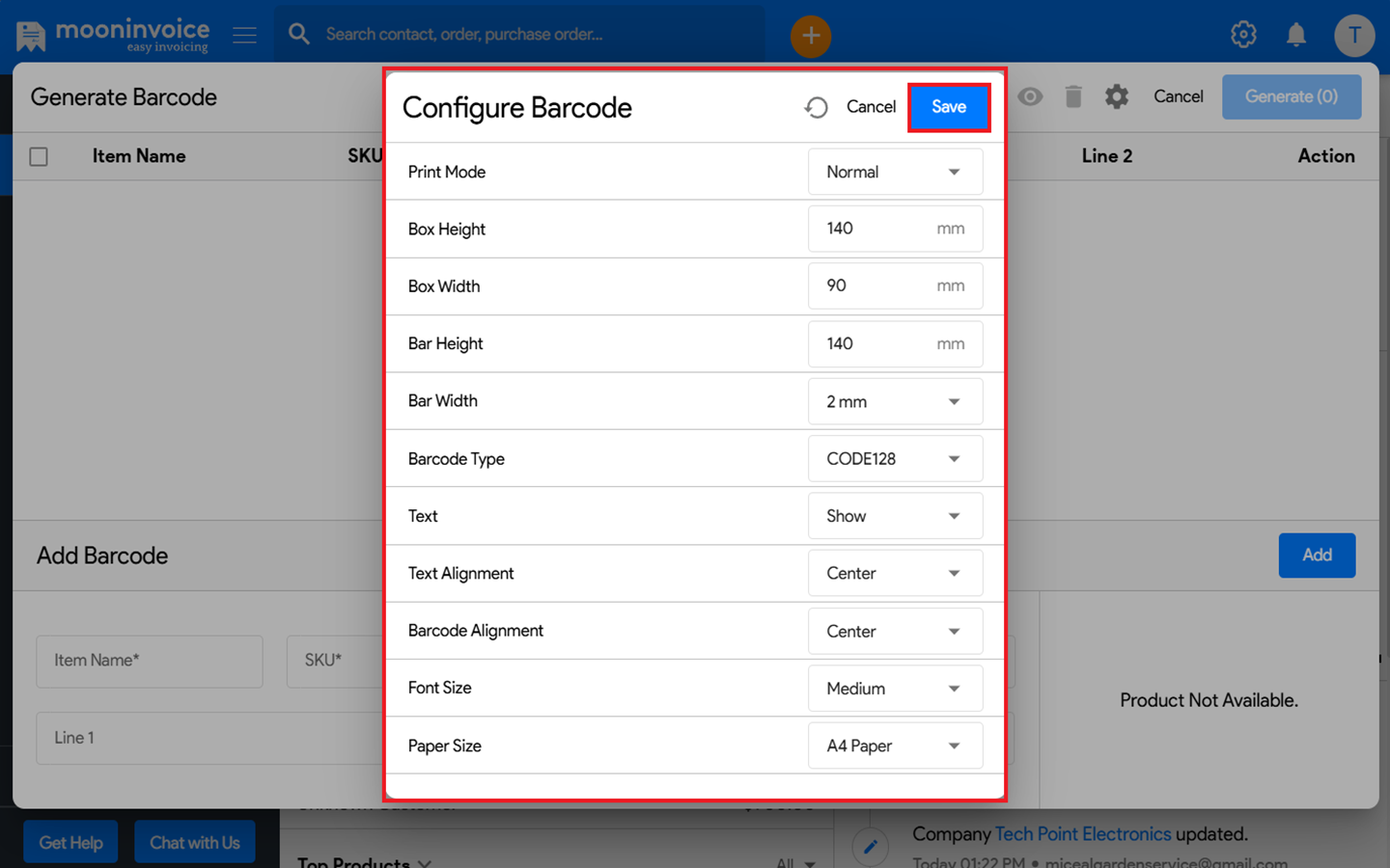 - Configure the barcode in Moon Invoice (matching the printer’s settings for size and alignment).