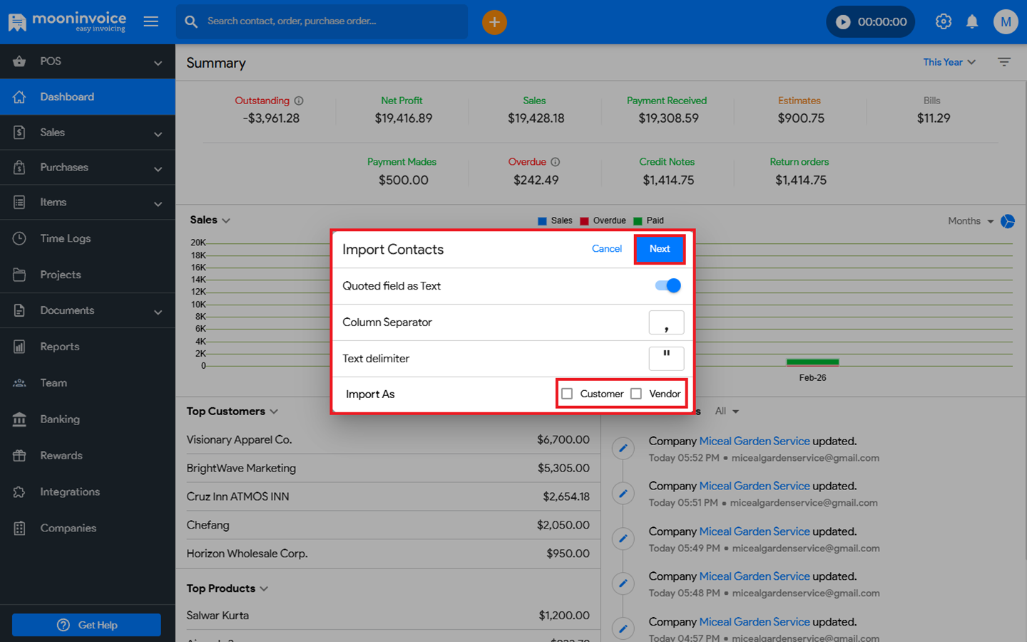 - Choose from Import as Customer or Vendor and click on Next.