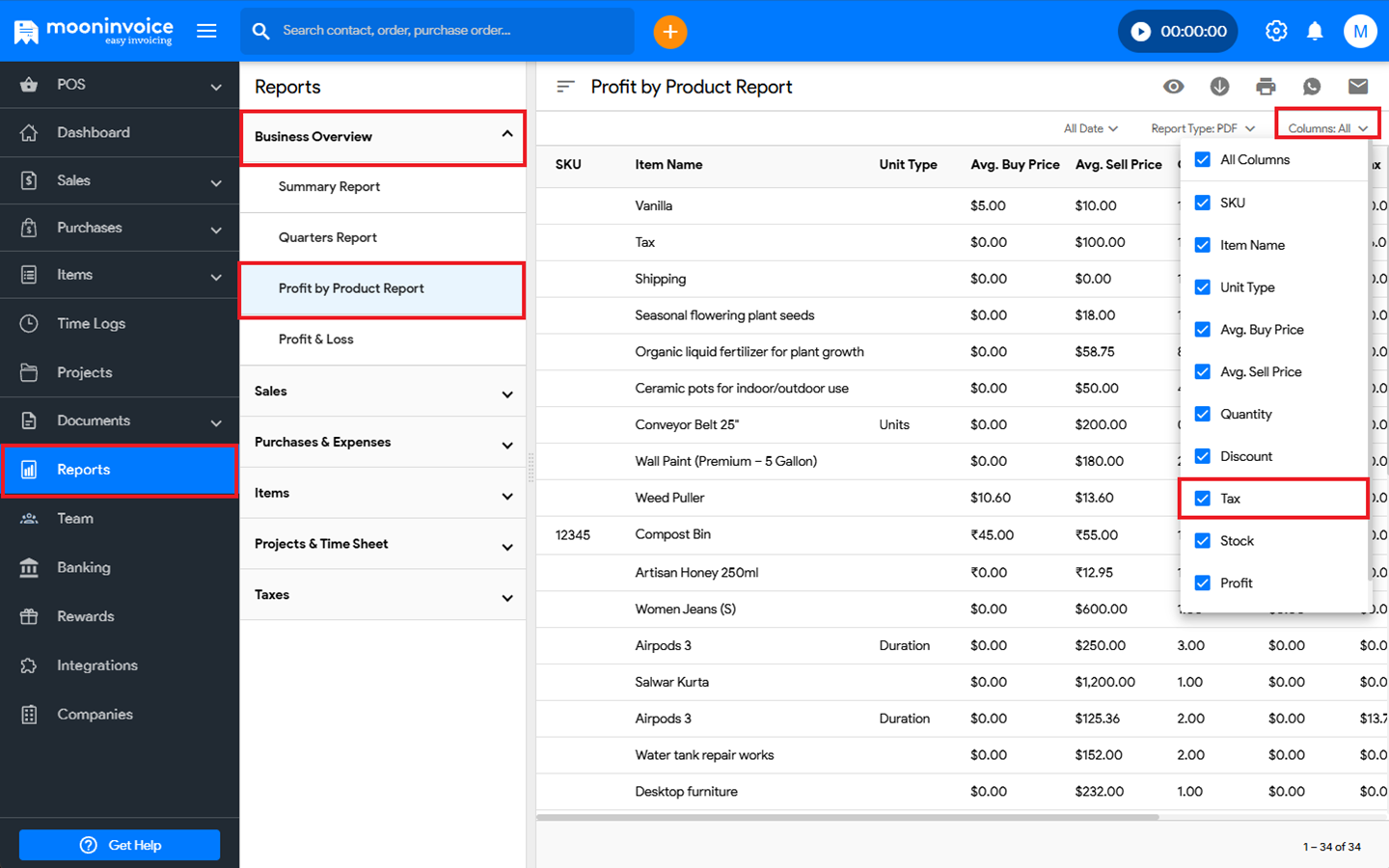 - In the Profit by Product Report section, under Columns: All filter, deselect the option the Tax option.